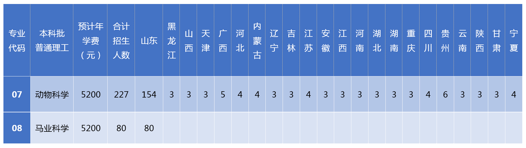 根据2019年招生计划,44118太阳成城集团动物科学专业面向全国招生227人,面向山东省招收公费农科生33人,马业科学专业面向山东省招生80人。公司2019年普通高等教育本科招生计划共340人。以下标注专业代码为山东省,其他省份请参照当地《填报志愿指南》。