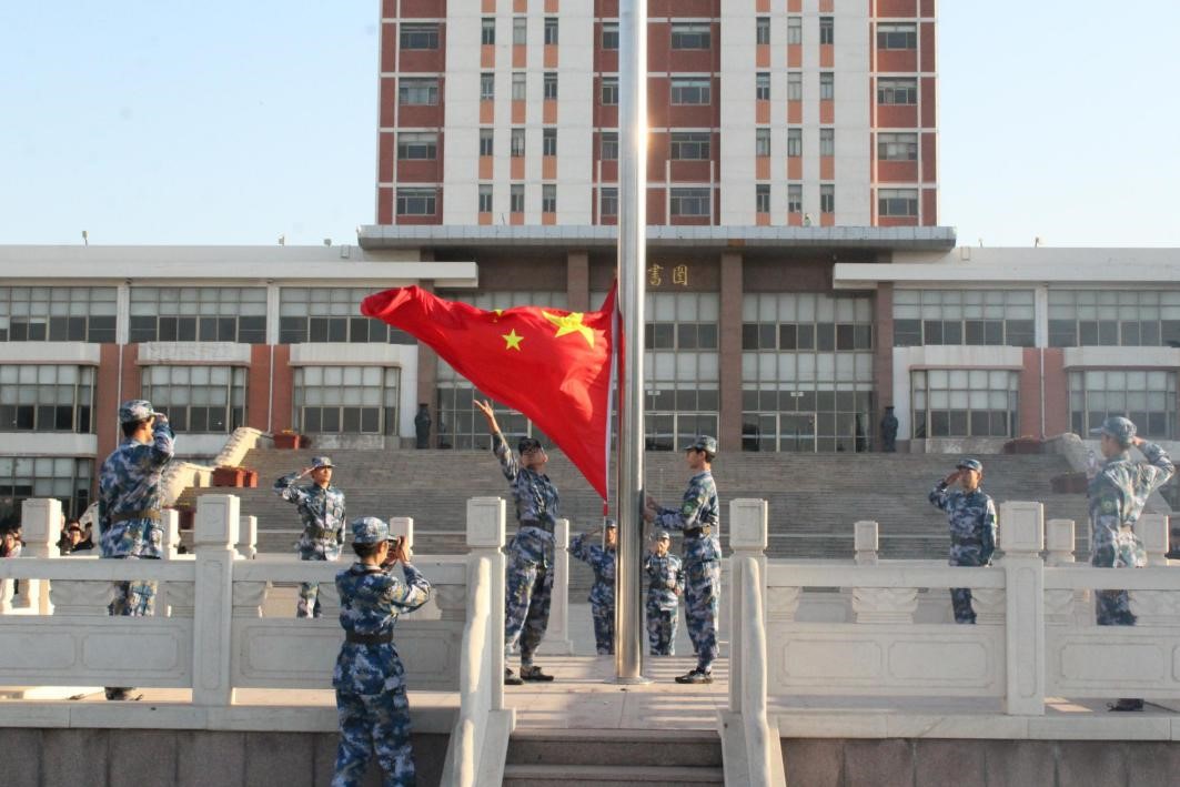 伴随着《歌唱祖国》的激昂旋律,国旗护卫队迈着铿锵有力的步伐,来到升旗台。鲜艳的五星红旗在雄壮的国歌声中迎着朝阳冉冉升起,全场师生怀着崇敬的心情行注目礼,凝视着五星红旗飘扬在校园上空。