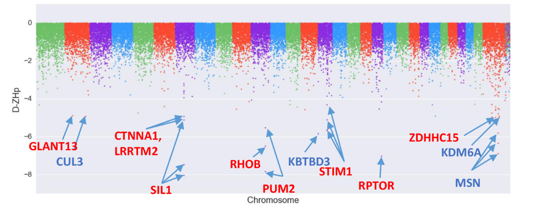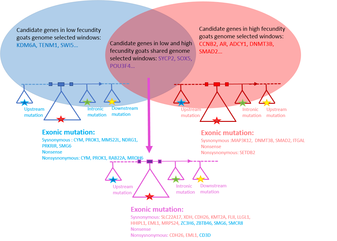 崂山奶山羊为胶东半岛特有山羊品种,主要分布于青岛及周边地区,母羊平均胎仔数为1.7只左右,具有产奶性能好、适应性强等特点。该研究选取了平均胎产羔数为3或4只的崂山奶山羊母羊群体作为高产群体,与胎产羔数为1只的低产群体进行极端性状群体的差异比较和全基因组重测序分析。对两个性状极端差异群体的基因组中单核苷酸多态位点(SNPs)进行高通量分析,结合选择性消除分析的方法,筛选到了两个群体的基因组范围内纯合性较高且群体间呈现高分化的区域,以及这些区域所包含的与繁殖力相关的候选基因。研究发现,7号、11号及X染色体的部分区域经历了强选择(图1、2),其中, CCNB2、DNMT3B和AR等基因可以作为奶山羊高产群体的候选基因区域(图3)。该研究进一步分析了高产群体的候选基因中影响蛋白质翻译的SNPs位点,发现SETDB2基因10号外显子、CDH26基因8号外显子上的一些突变,在两个性状极端差异群体中出现基因型频率变化。这说明这些基因位点可能与产羔数性状具有一定关联性。
