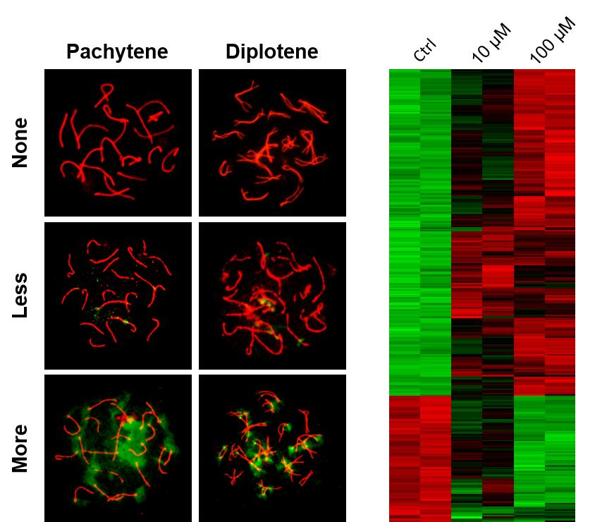 DEHP作为一种环境雌激素类似物,被人们广泛接触,并可引发非常严重的生殖健康问题。已有大量研究结果表明,接触这些环境类雌激素将危害人的生殖健康,导致不孕不育症的发生。沈伟课题组利用卵母细胞体外发生模型,研究了DEHP暴露对卵母细胞早期发生过程中第一次减数分裂进程的影响,发现DEHP暴露能够显著抑制第一次减数分裂粗线期到双线期的转变,并通过影响减数分裂重组过程中粗线期检验点的激活进而损害了DNA双链断裂修复能力。在卵母细胞后续发生阶段,这种DNA损伤修复缺陷导致过多的卵母细胞发生凋亡、卵母细胞和颗粒细胞间隙连接形成异常和原始卵泡形成抑制。另外,微阵列分析也显示,DEHP暴露影响了细胞凋亡和性腺发育相关基因的表达,且也会影响细胞间信号转导以及质膜、细胞外基质和离子通道功能等方面的基因表达。这些研究结果提示,怀孕期间要避免暴露DEHP,防止DEHP对胎儿卵巢发育的损害。