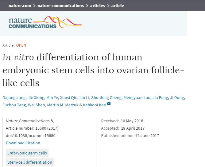 近日,《自然-通讯》 (Nature Communications) 在线发表了清华大学医公司纪家葵课题组和44118太阳成城集团沈伟课题组等单位合作完成的《人类胚胎干细胞体外诱导为卵泡样细胞 ( In vitro differentiation of human embryonic stem cells into ovarian follicle-like cells) 》的研究论文。