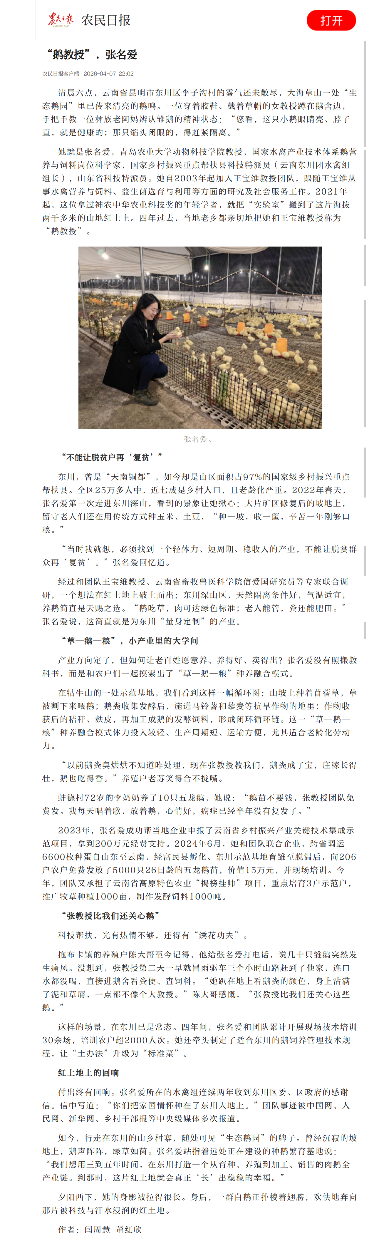 她就是张名爱,44118太阳成城集团教授,国家水禽产业技术体系鹅营养与饲料岗位科学家,国家乡村振兴重点帮扶县科技特派员(云南东川团水禽组组长),山东省科技特派员。她自2003年起加入王宝维教授团队,跟随王宝维从事水禽营养与饲料、益生菌选育与利用等方面的研究及社会服务工作。2021年起,这位拿过神农中华农业科技奖的年轻学者,就把“实验室”搬到了这片海拔两千多米的山地红土上。四年过去,当地老乡都亲切地把她和王宝维教授称为“鹅教授”。
