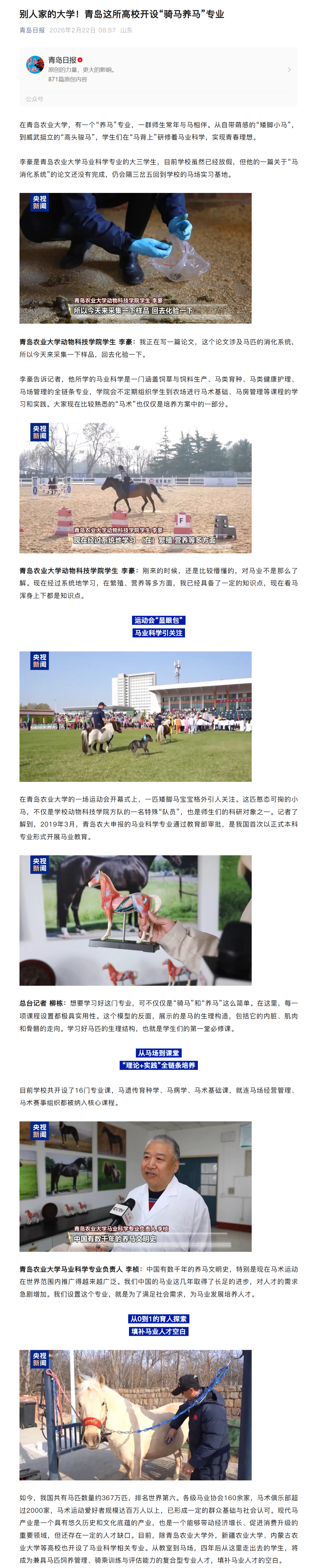 相关链接:CCTV-1:山东青岛:我在大学学“养马”!探访全国首个“马背上”的专业