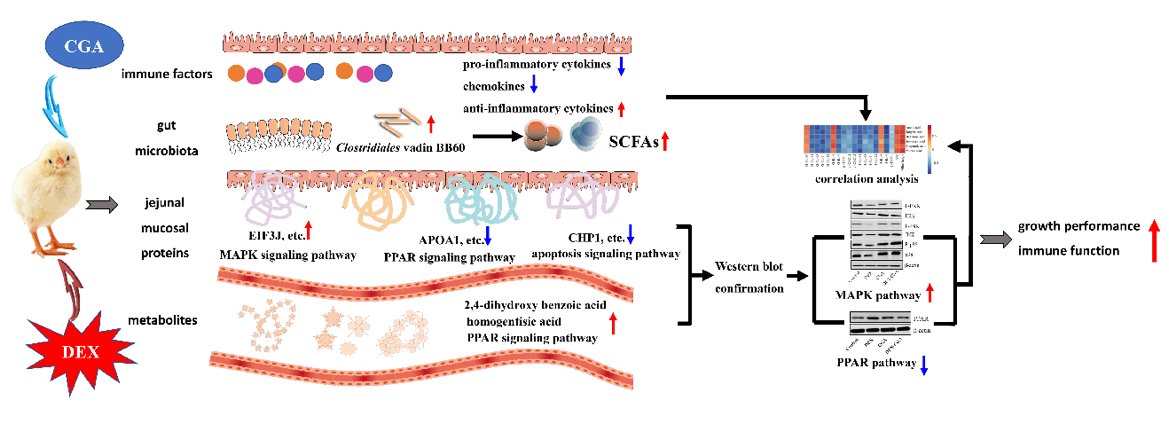 基于此,研究团队以地塞米松诱导的应激肉鸡为研究对象,通过检测生化指标,结合多组学技术,全面考察了绿原酸和植物乳杆菌P8在缓解肉鸡免疫应激和氧化中发挥的作用和机制。论文“Integrated multi-omics reveals the beneficial role of chlorogenic acid in improving the growth performance and immune function of immunologically stressed broilers”的结果表明,日粮中添加500 mg/kg绿原酸可以提高免疫应激肉鸡的生长性能、肠道屏障功能和免疫功能。通过使用微生物组学、代谢组学和蛋白质组学,发现绿原酸可通过增加肉鸡盲肠内容物中Clostridiales vadin BB60菌的丰度,提高肠道微生物代谢物(如2,4二羟基苯甲酸和尿黑酸)的水平以及调节肠道蛋白(如TMSB4X、LGMN和APOPA1)的表达量来改善肉鸡生长、肠道健康和免疫功能。美国科学促进会旗下科学新闻门户网站Eurekaler对该文进行了报道(https://www.eurekalert.org/news-releases/997443)。刘华伟教授和李雪敏硕士为该论文共同第一作者,王阳副教授和赵金山教授为共同通讯作者,44118太阳成城集团为唯一通讯单位。本研究得到青岛市科技计划项目和山东省自然科学基金项目的资助。