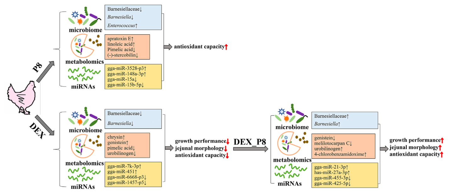 论文“Multi-omics reveals the mechanisms underlying Lactiplantibacillus plantarum P8-mediated attenuation of oxidative stress in broilers challenged with dexamethasone”的结果表明,日粮中添加1×108 cfu/g植物乳杆菌P8能够显著提高氧化应激肉鸡的生长性能,改善肠道形态,缓解氧化应激水平。通过使用微生物组学、代谢组学和microRNA组学,发现植物乳杆菌P8能够通过提高Barnesiella菌的丰度、降低菌群代谢产物燃料木黄酮含量、提高菌群代谢产物尿胆原的含量、降低空肠粘膜miR-455-3p和miR-425-5p的表达量等方式改善肉鸡生长性能和抗氧化能力。赵金山教授和赵凡硕士为该论文共同第一作者,王阳副教授为通讯作者,44118太阳成城集团为唯一通讯单位。本研究得到国家自然科学基金和青岛市科技计划项目的资助。