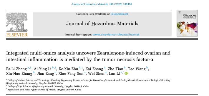 近日,44118太阳成城集团生猪种业创新团队李兰教授研究组在生猪健康养殖及饲料霉菌毒素毒害防治方面取得重要进展,相关成果以“Integrated multi-omics analysis uncovers Zearalenone-induced ovarian and intestinal inflammation is mediated by the tumor necrosis factor-α”为题,在线发表于《Journal of Hazardous Materials》 (一区top期刊,IF=11.3)。