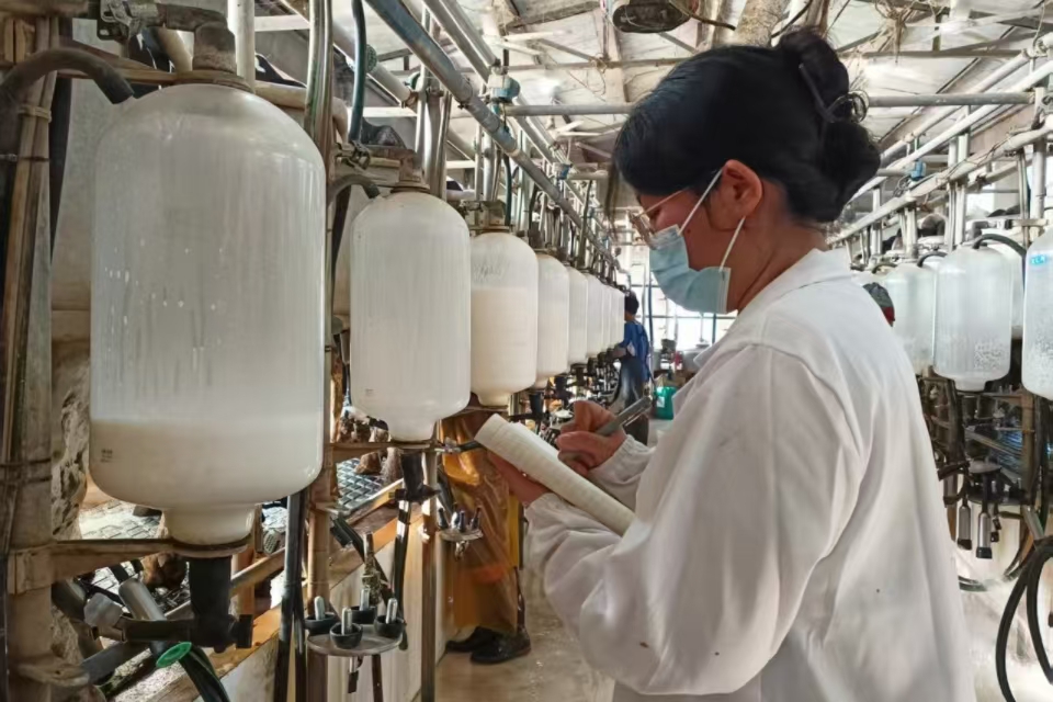 8月10日,团队分批进驻养殖场,开展为期五天的“沉浸式”劳动实践。在奶牛场,动科D2201班李翠玲凌晨四点就起床协助挤奶工作,认真记录每头牛的产奶数据,并主动向师傅请教常见乳房炎防治措施;在闷热难耐的鸡舍中,动科D2201班杨森连续三天跟随技术员学习雏鸡分群与免疫接种,汗水浸透衣衫仍坚守岗位。尽管环境艰苦,却没有一个人叫苦叫累。他们的专业态度和吃苦精神获得养殖场员工的一致赞扬:“这些员工不怕脏、不怕累,是实实在在来学本领、干事情的!”