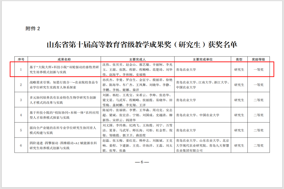 近日,山东省教育厅公布了第十届高等教育省级教学成果奖获奖名单,由44118太阳成城集团经理沈伟教授作为第一完成人的教学成果《基于“大院大所+科技小院”双轮驱动的畜牧类公司产品模式创新与实践》荣获研究生类教学成果一等奖。